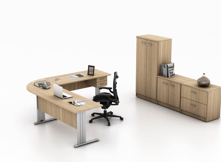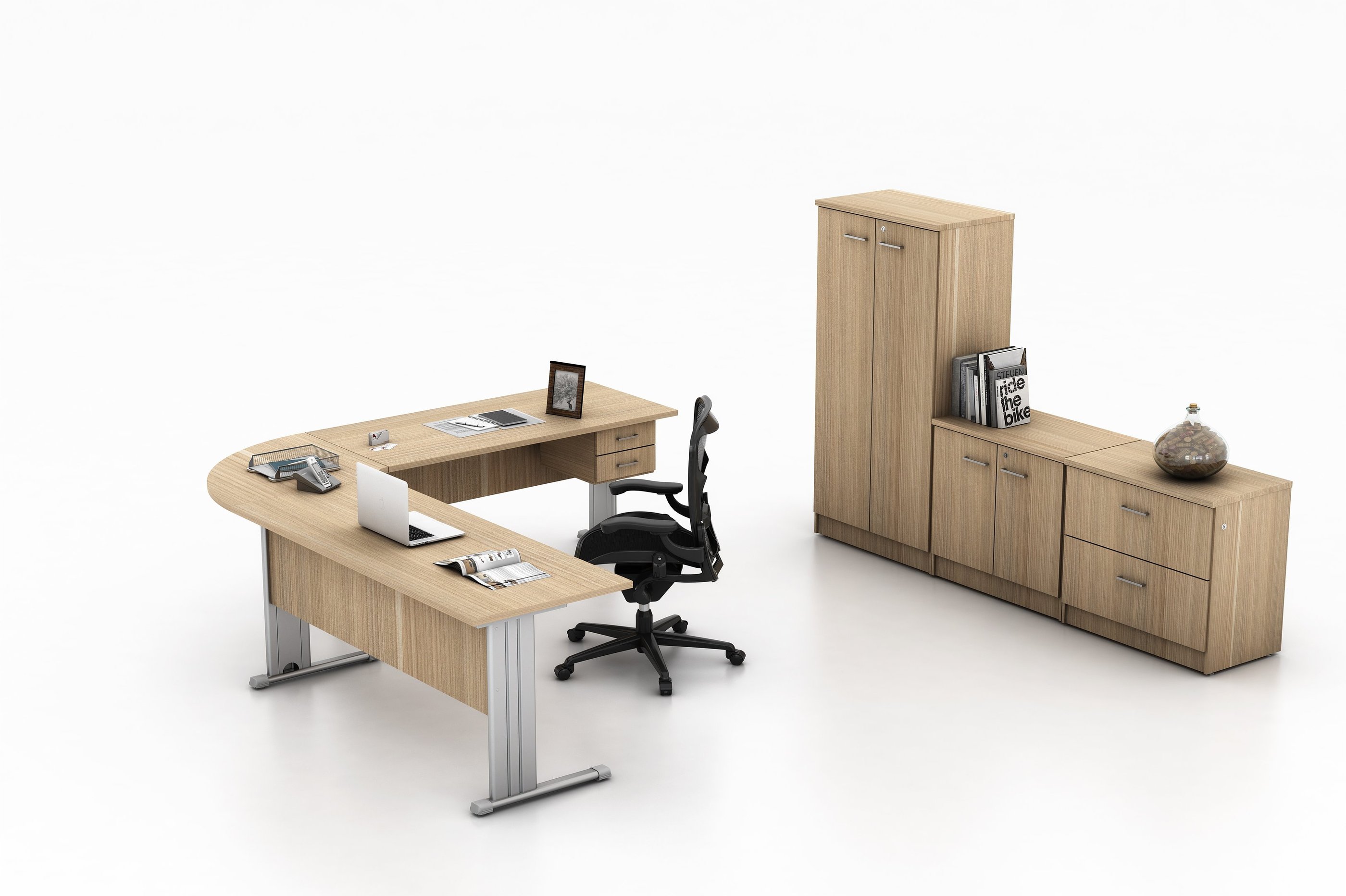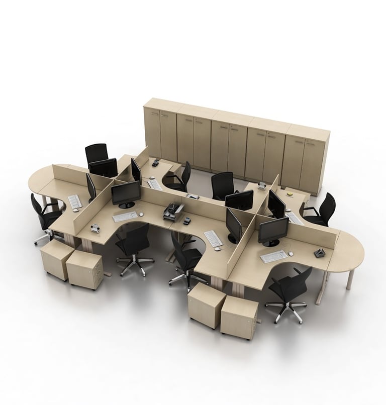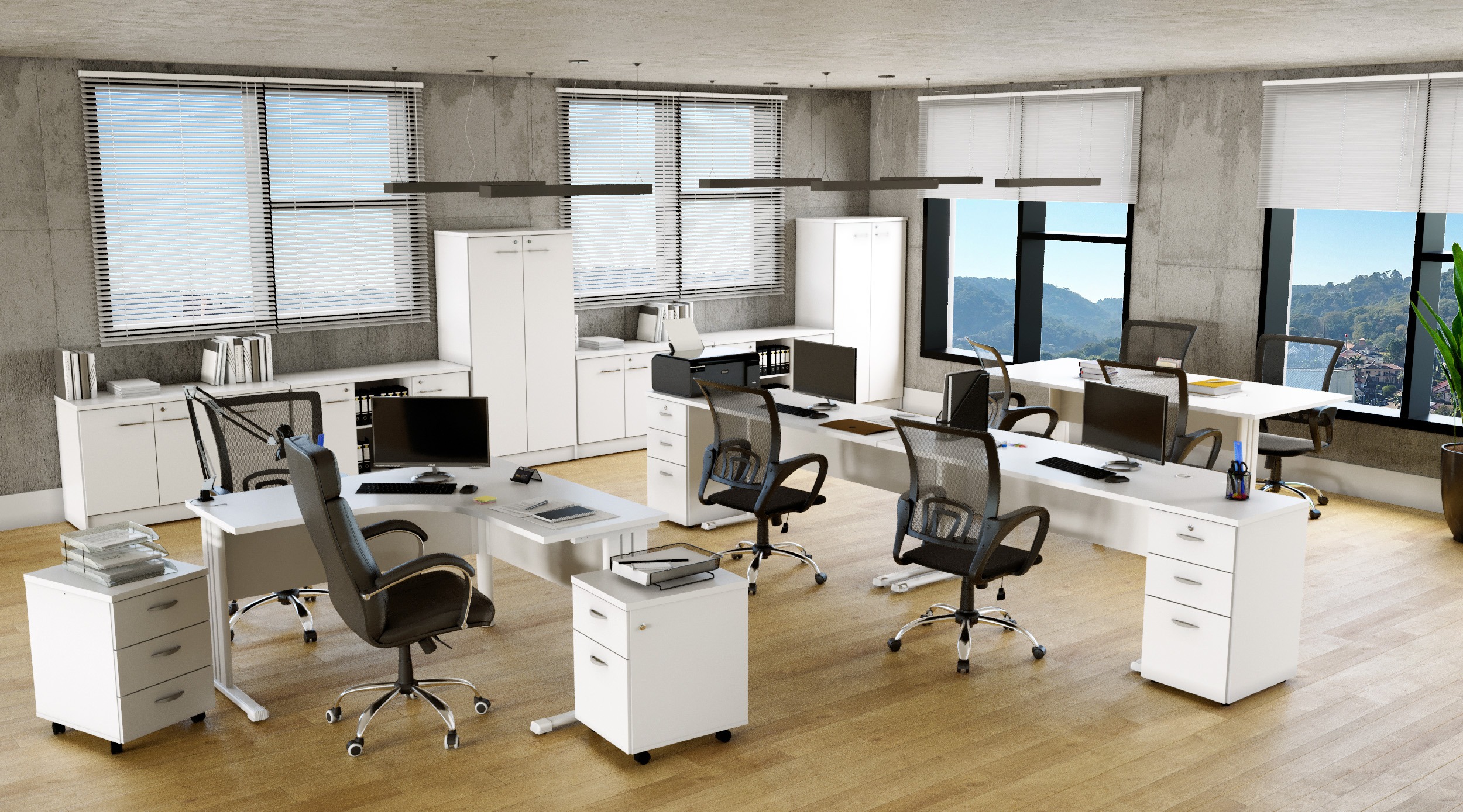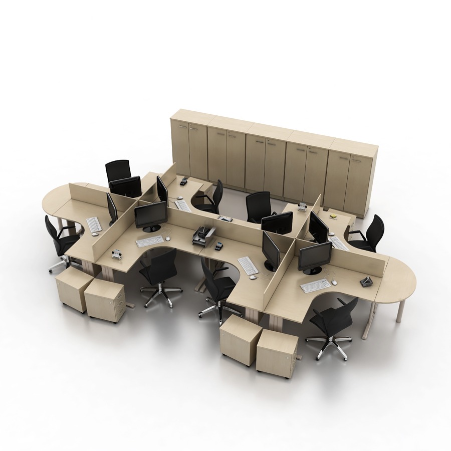A linha New Office é perfeita para a montagem de grandes espaços que demandam a articulação de um staff numeroso, com opções de prolongamentos, configurações em L e uma linha de complementos com diversos acessórios.